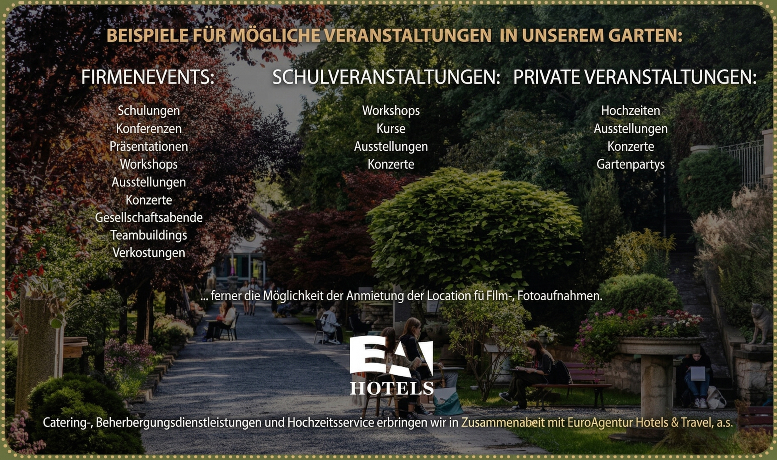 Der Kunstgarten ist ein einzigartiger Ort fast im Zentrum von Prag (in Nusle unterhalb von Vyšehrad) mit einem unverwechselbaren Genius Loci. Er ist eine ruhige, blühende Oase inmitten der Metropole. Genau hier können Sie Ihre private oder geschäftliche Veranstaltung ausrichten – sei es eine Hochzeit, eine Gartenparty, eine Konferenz, eine Präsentation, ein Konzert, ein gesellschaftlicher Abend, eine Verkostung, eine Ausstellung oder Ähnliches.